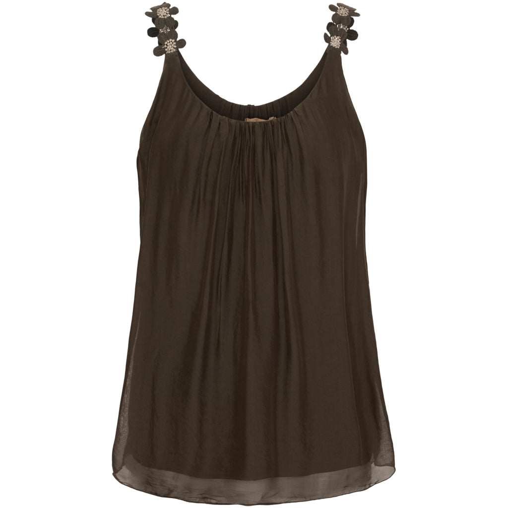 Vacker topp med blommor på axelbanden och skön passform.S/MBystvidd: ca. 112 cm.Längd: ca. 50 cm.L/XLBystvidd: ca. 114 cm.Längd: ca. 51 cm.Material: 70% Viskos, 30% Silke