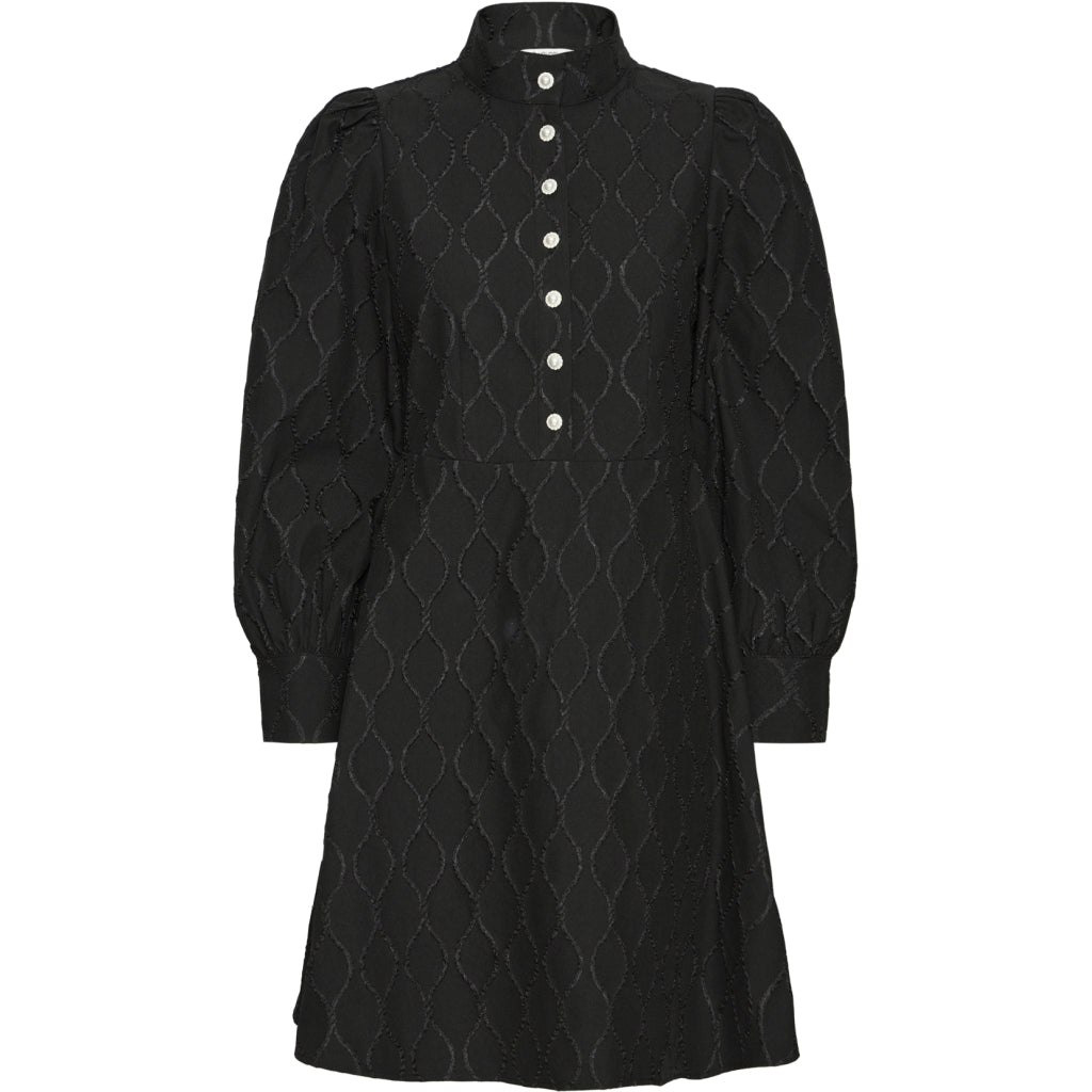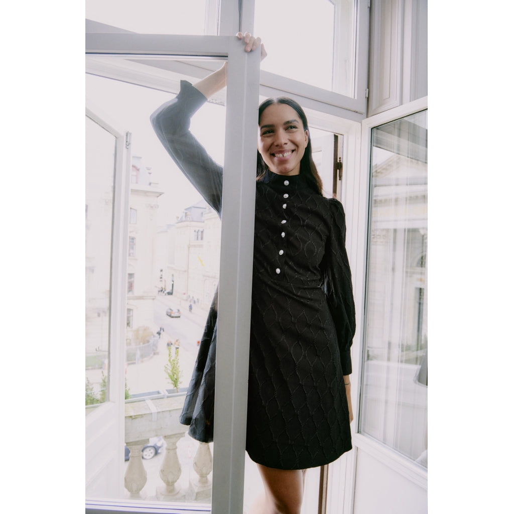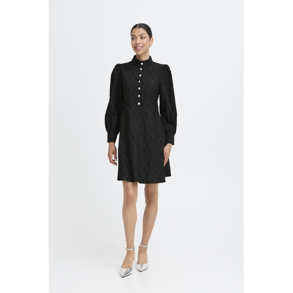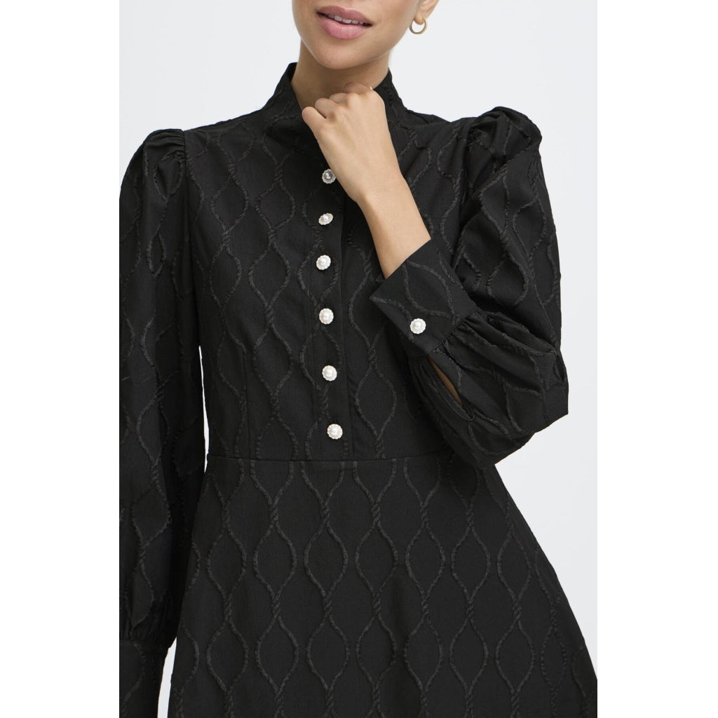 Superfin och elegant klänning från B.Young med vackert mönster. Klänningen har en liten krage, genomgående knappar och puffärmar. Den kan stylas med strumpbyxor och ett par stövlar eller klackskor.