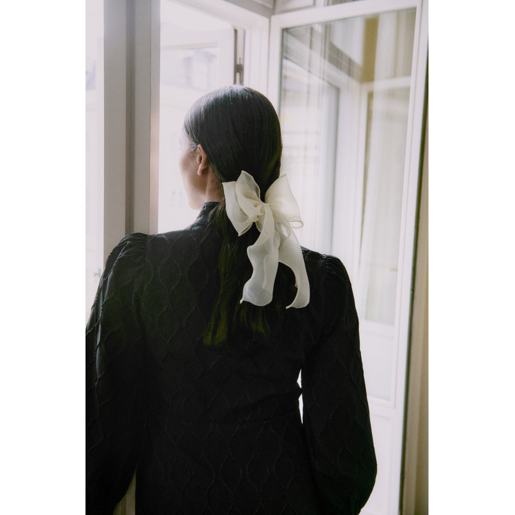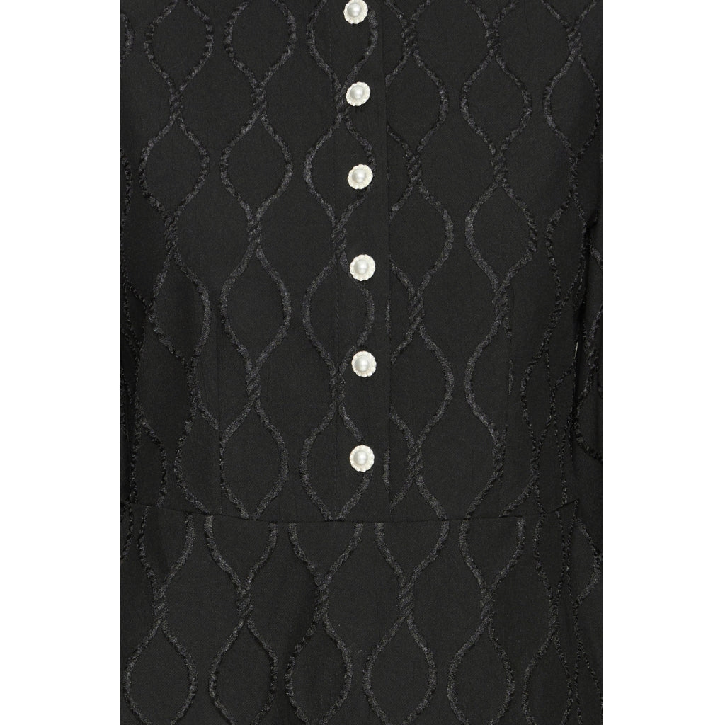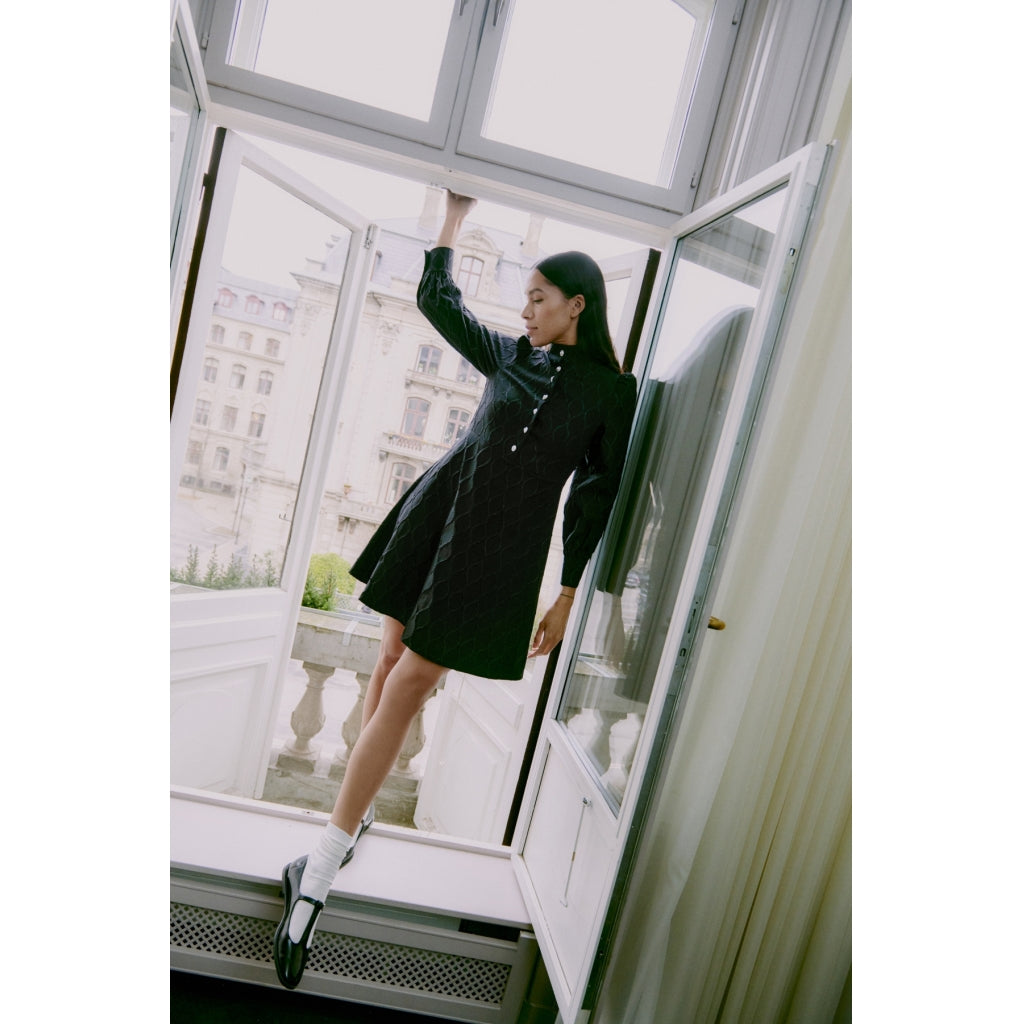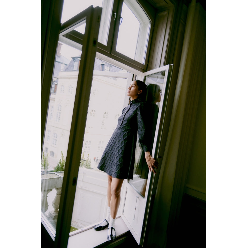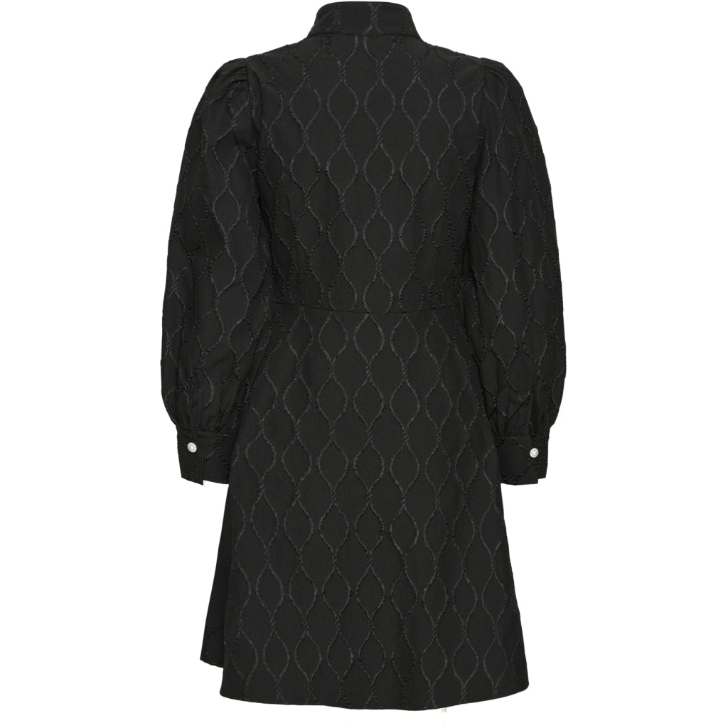 Superfin och elegant klänning från B.Young med vackert mönster. Klänningen har en liten krage, genomgående knappar och puffärmar. Den kan stylas med strumpbyxor och ett par stövlar eller klackskor.