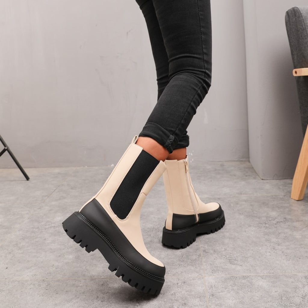 Støvlen har lynlås i ene side, og elastik i siderne.