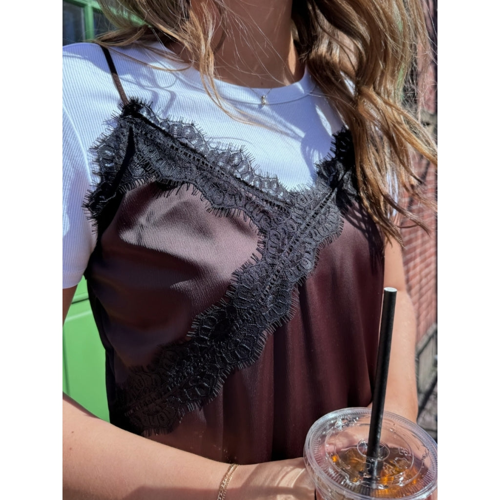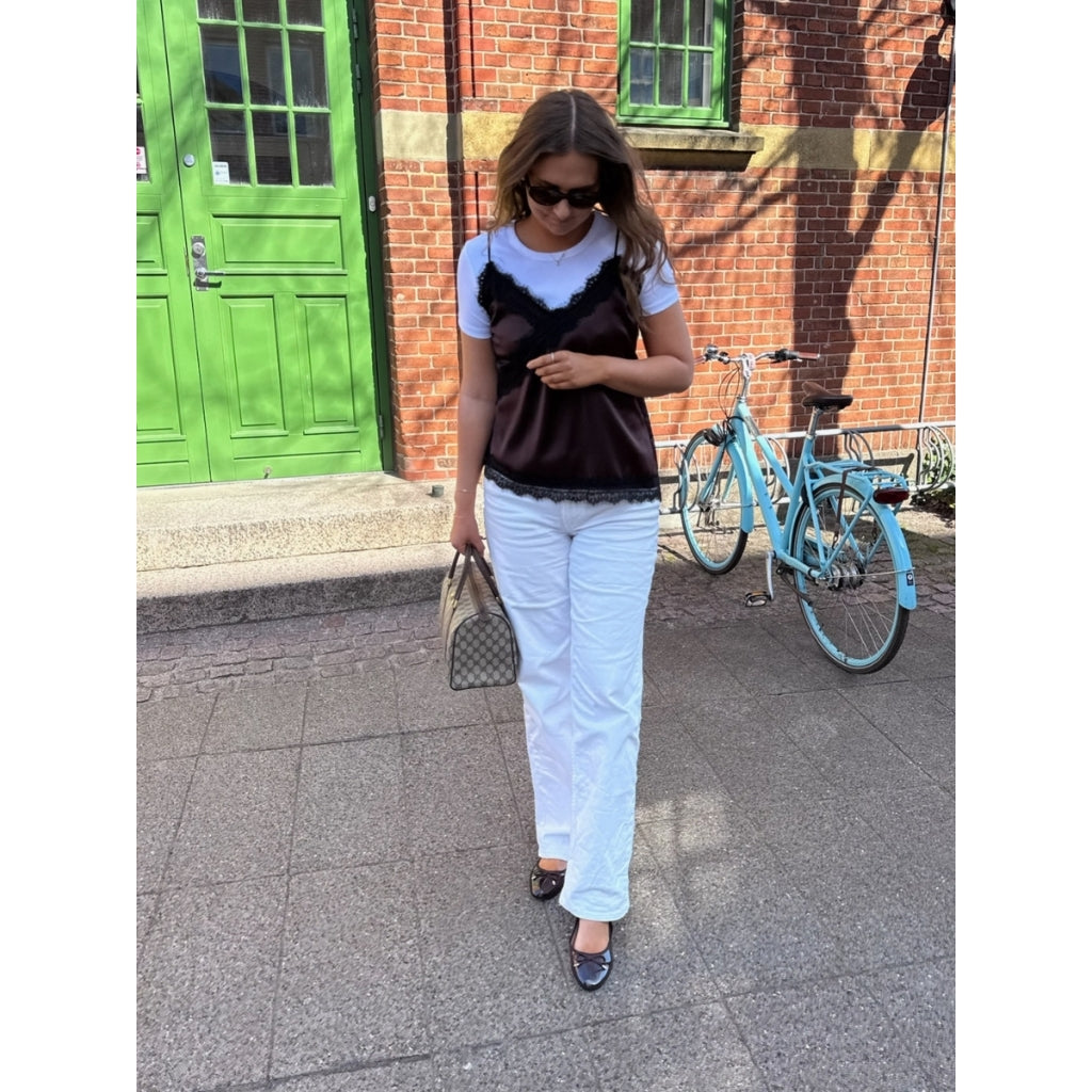 Smuk satin top med flotte blonde kanter som giver et elegant look.