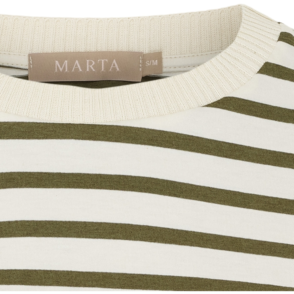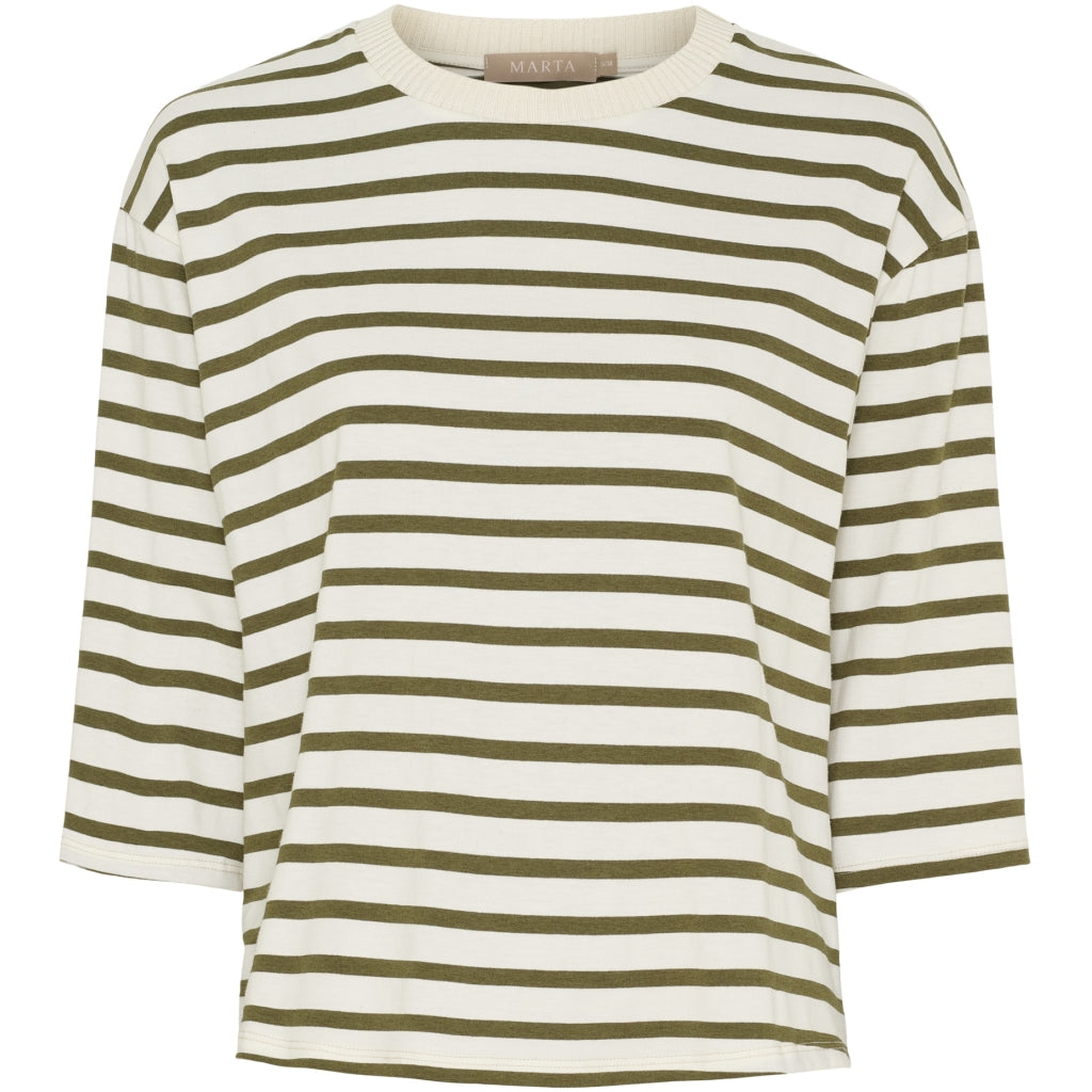 En grundläggande och bekväm randig t-shirt från Marta Du Château. Den har en rund hals med ribbstickad kant och 3/4 ärmar. Perfekt för vardagen ihop med antingen jeans, byxor eller kjol.