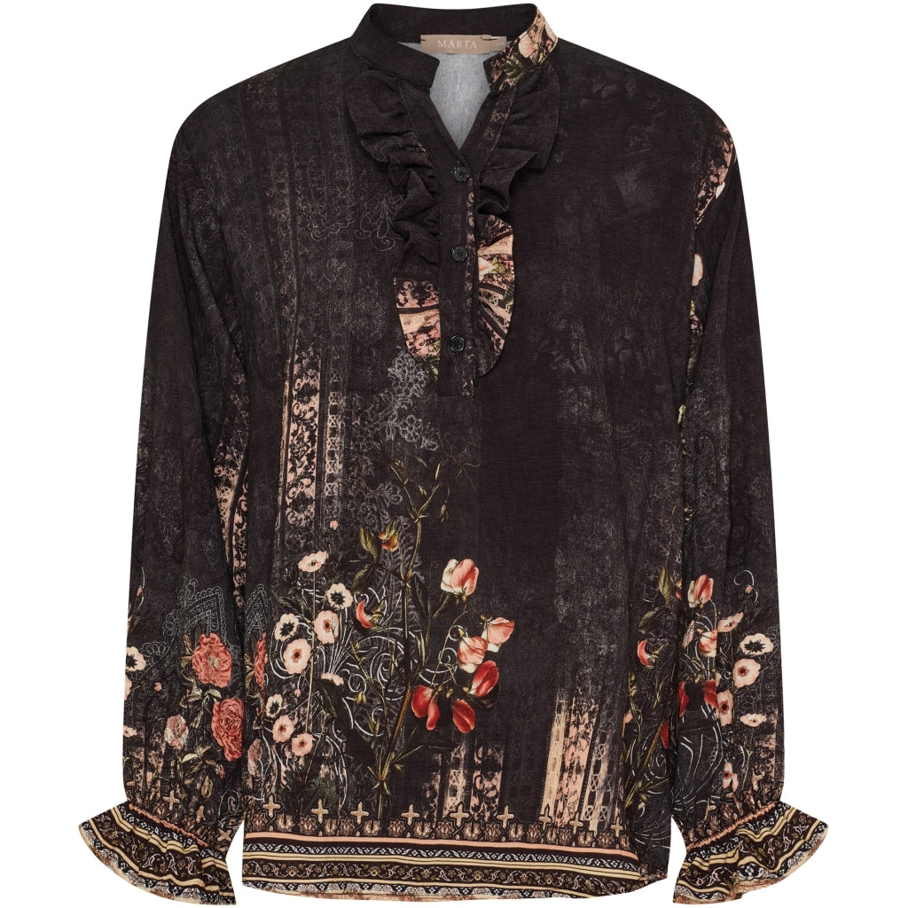 Vacker tryckt skjorta från Marta Du Château med V-ringning och volangdetalj. Skjortan har knappar framtill och resår i ärmarna. Perfekt både för vardagsbruk och finare tillfällen.