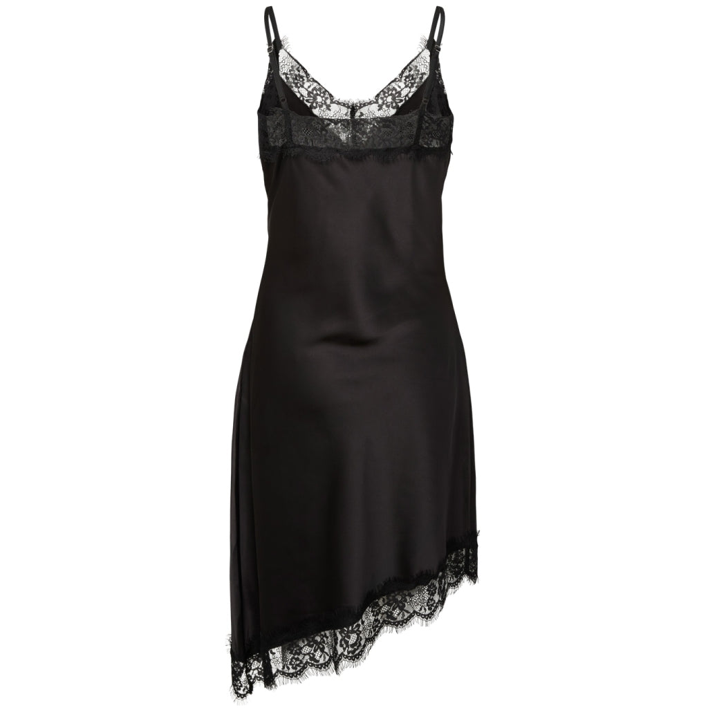 Kort klänning med asymmetrisk skärning och justerbara band, designad med spets och satinväv för en slät, blank finish. Ärmlös med V-ringning och längre passform.