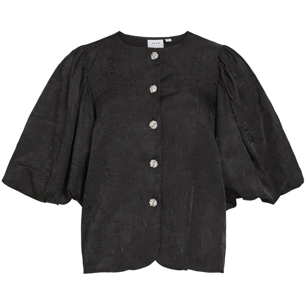 Svart 2/4 topp från VILA med ballongärmar och rund hals. Stängs med knappar och regular fit för en bekväm passform.